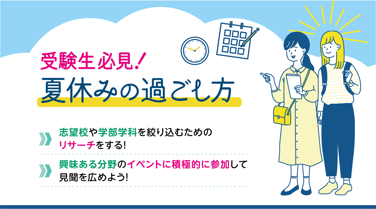 高3生は生活リズムを崩さないように過ごし、志望校の決まっていない人はその絞り込みを急ぎましょう。大学や学部学科によって受験科目や対策が異なることもあるので、早めに受験校を決定し、夏休みは効果的な勉強に励んでください。