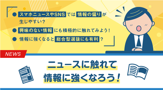 日常からニュースに触れ、わからないことを調べる習慣がつくことで、大学入試の総合型選抜で有利になるかもしれません。総合型選抜では、受験者が大学のアドミッションポリシーに合っているかどうかを見るために面接が行われますが、それが非常に重要な試験項目となります。面接でよく聞かれる質問には、志望理由や入学後にやりたいこと、自分の長所・短所、高校で頑張ったことなどのほか、「最近気になったニュース」や「〇〇のニュースについてどう思いますか」といった質問をされることがあり、普段からニュースに触れていないと、回答がしどろもどろになってしまいます。日頃からニュースをチェックして、社会で起きている出来事や社会情勢に興味を持つようにしておきましょう。